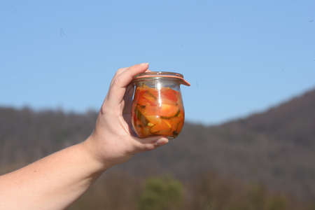 Homemade preserved, fermented food, pickled, marinated vegetables, fruit compote