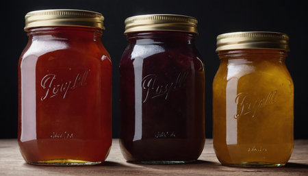 Variety of fruit jams lined up next to each other. AI-generated.