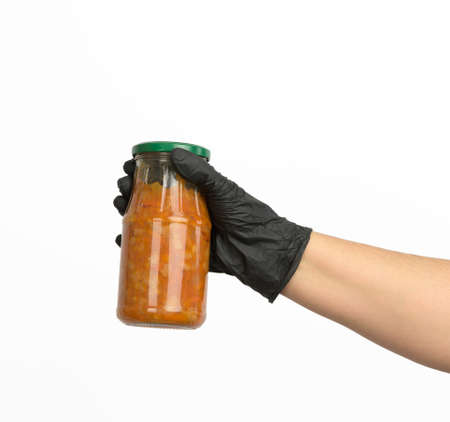 female hand in a black glove holds a glass jar with cooked beans in tomato sauce on a white background
