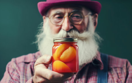 A man with a beard holding a jar of peaches. AI generative image.