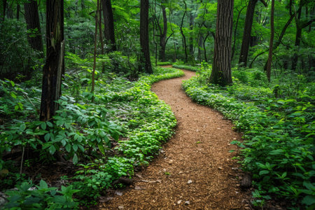 Serene dirt path meanders through dense deciduous forest with towering trees and lush undergrowth. Atmospheric lighting creates mystical mood perfect for nature, wellness, adventure
