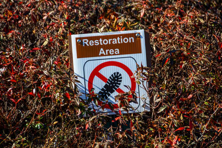 Pano Restoration Area sign agaisnt desert landscape at Joshua Tree National Park