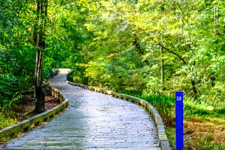 The wooden Appalachian Trail? boardwalk through a nature reserve park with tall, dry grasses