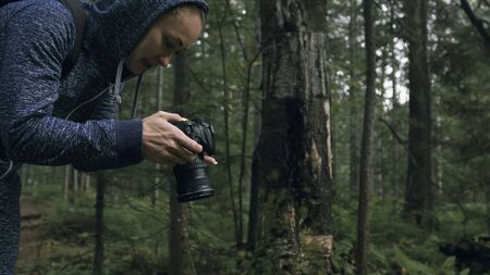 Photographer man holding a camera in a forest.