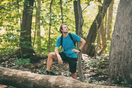 Hiking man hiker walking in forest woods trail looking up searching for bird watching leisure activity in summer nature of Canada.
