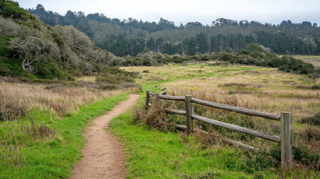 A serene nature trail bordered by a rustic wooden fence invites exploration in this tranquil landscape filled with lush greenery and distant hills.
