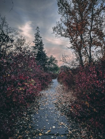 A tranquil autumn scene in Gothenburg, Sweden with a board walk leading into the forest. The bare tree stands tall against the land and serves as a reminder of natures beauty and growth.