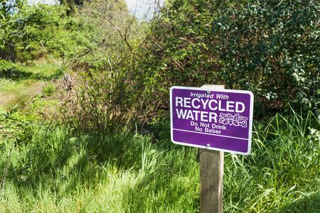 Irrigated with Recycled Water; Do Not Drink sign posted in a public park in Santa Clara, South San Francisco Bay Area, California