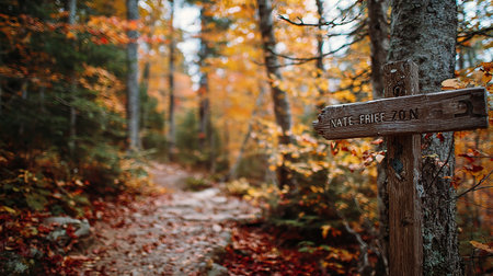 Wooden signpost on the trail in autumn forest with colorful leaves