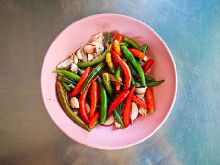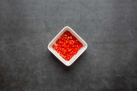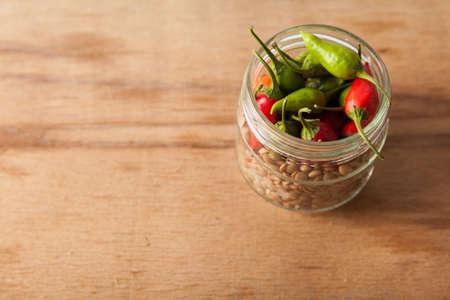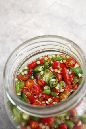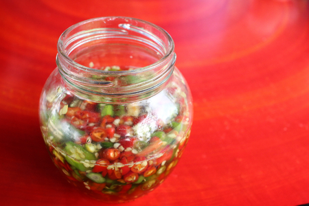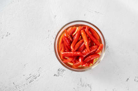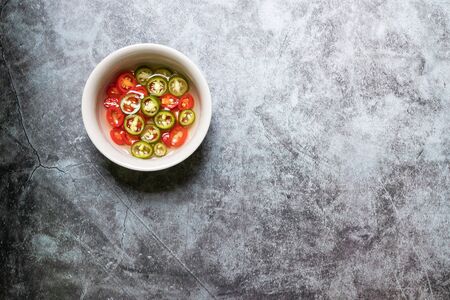 Green and red pickled chili in vinegar with copy space on background. Top view