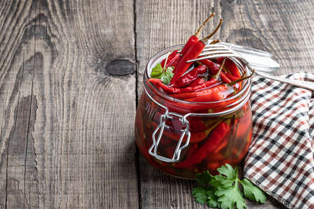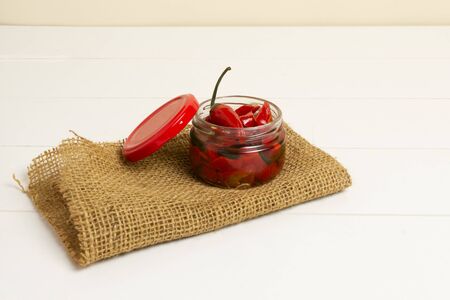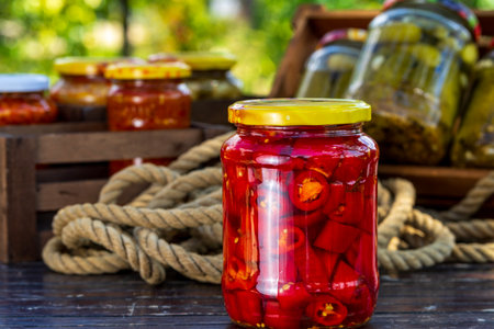 Glass jars with pickled red bell peppers.Preserved food concept, canned vegetables isolated in a rustic composition.