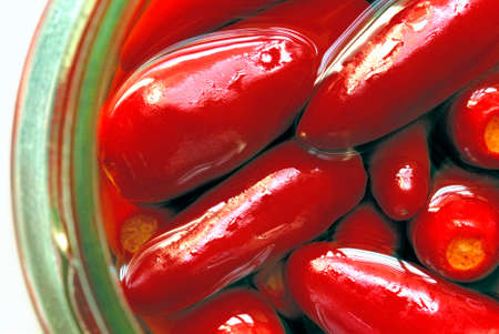 Preserved Vegetable Roasted Red Peppers with Garlic in Glass Jar. Ready to Eat.