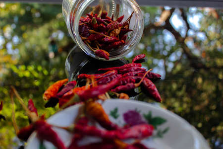 In selective focus a group of dried red Thai Chili drying to the sun on a silver sheet in outdoor