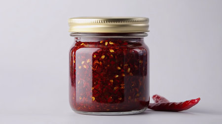 A vibrant jar of red chili sauce featuring a golden lid on a clean white background. Ideal for cooking, dipping, or enhancing flavors in dishes.