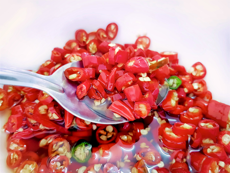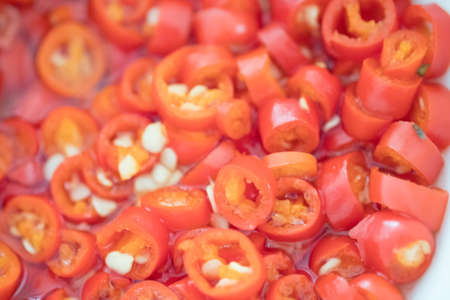 High Angle View of Sliced Pickled Red and Green Chilies in Vinegar