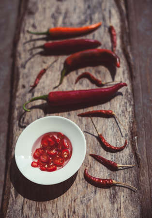 hot red pepper mini chili pods on wooden background, horizontal row of hot vegetables