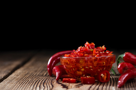 Hot pepper jam with steam coming from it on wooden table and spicy peppers on table