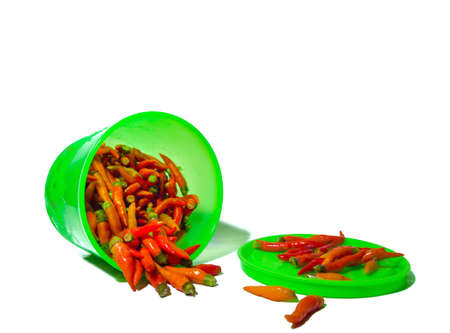 Some red chilies are in a green jar placed in a jar with spilled on white paper and isolated on a white background. red chili isolated on a white background