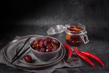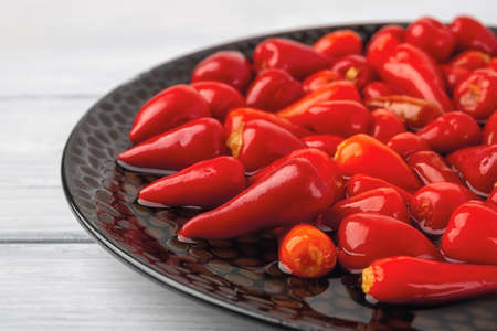 Close-up of pickled baby red hot peppers on a black plate. Marinated pods of small hot pepper close-up. Fermented organic vegetable snacks and condiments. Сrispy tasty pickles. Shalow DoF. Front view.