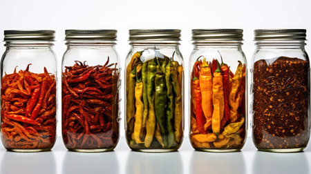 picture of a Glass jar of preserved red and green chilli isolated on white background