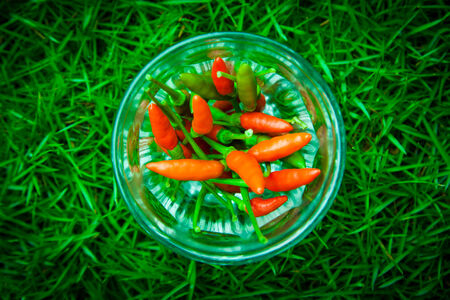 The chili peppers freshest and hottest, In the hand, On the lawn