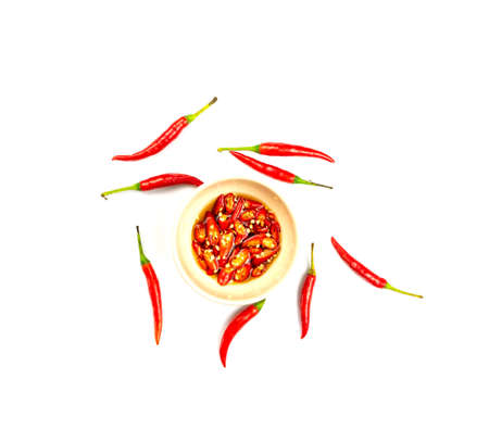Closeup top view red chili pepper with sliced on white background, raw food ingredient foto concept