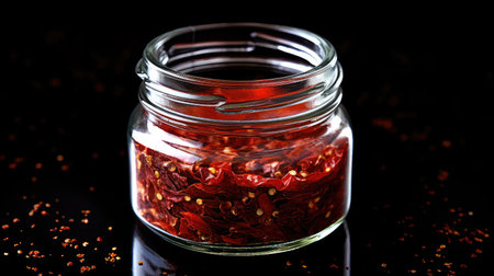 Vibrant red chili oil with visible flakes in a clear glass jar, presented on a dark surface with dramatic lighting and scattered chili pieces.