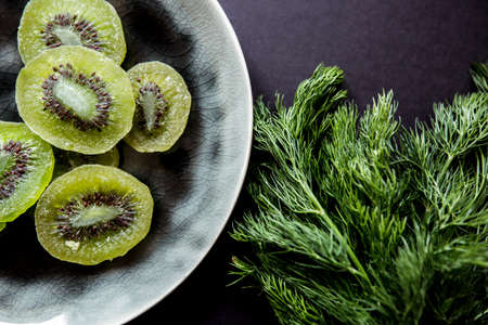 dried kiwi, dill and plate in raku-yaki style on a black background