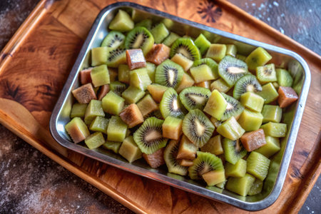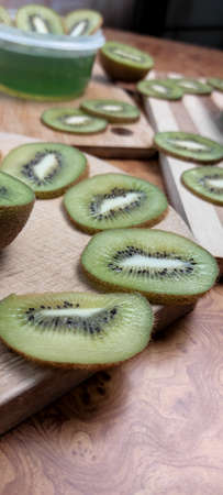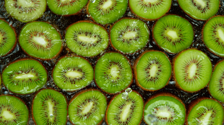 Freshly cut kiwi shows vibrant green inside, inviting summers sweetness to delight.