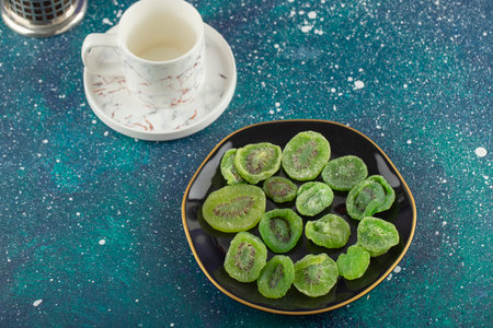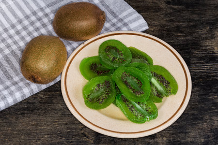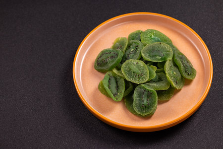 Bright green dried kiwi slices, offering a sweet and tangy flavor, sitting on a terracotta colored plate against a dark, textured background, providing a convenient and healthy snack option