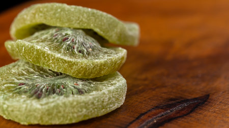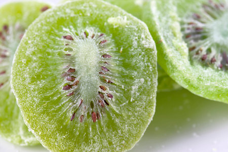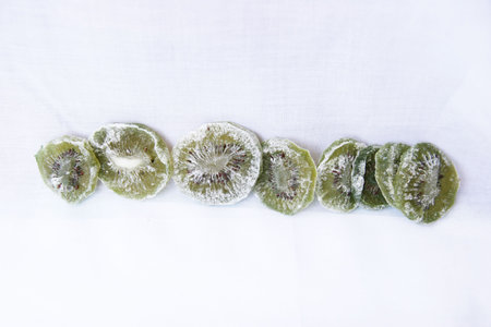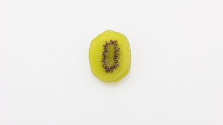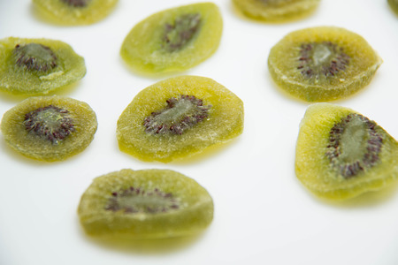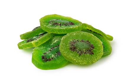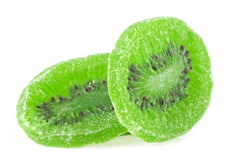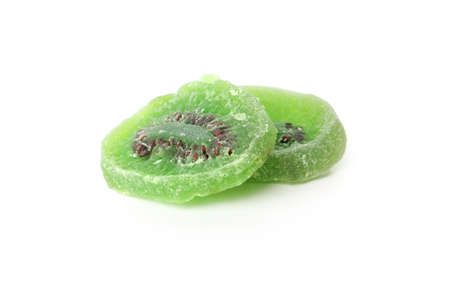 Slices of dried kiwi fruit isolated on a white background. Candied kiwi fruit.