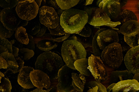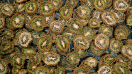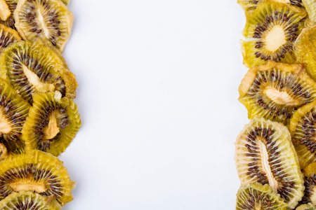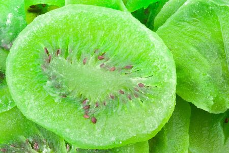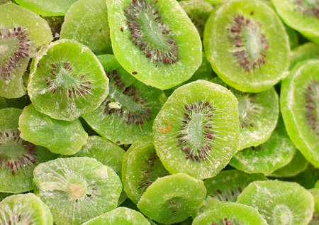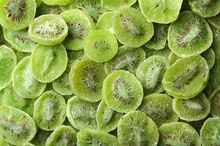Tasty slices of kiwi as background, top view. Dried fruit as healthy food