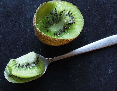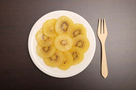 Healthy, eating and diet concept; Idea with slice of ripe yellow kiwi(or gold kiwi) in white plate on dark table top.