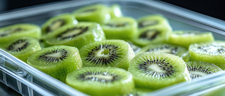 Fresh kiwi slices in a plastic container, vibrant green, healthy snack, closeup, bright and crisp