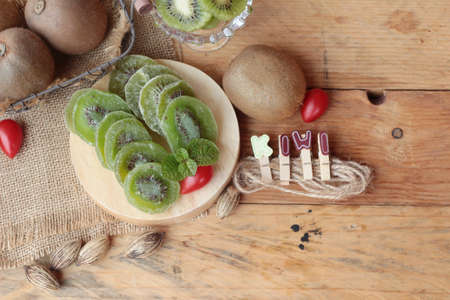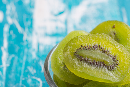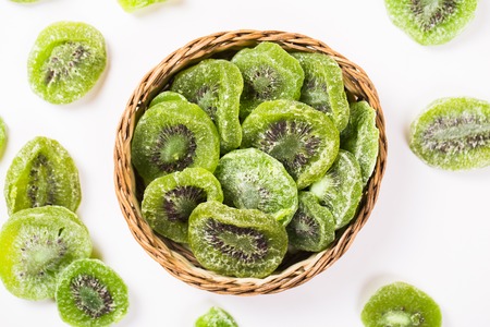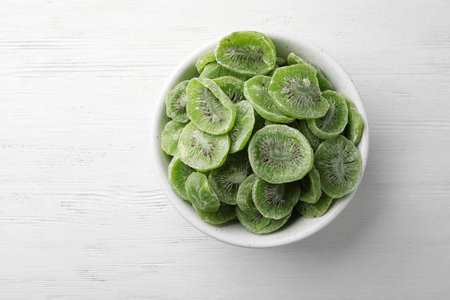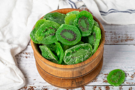 Dried kiwi slices in wooden bowl. Sun-dried natural kiwi slices on a white wood background. close up