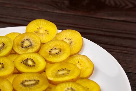 Kiwi Gold fruit. Yellow kiwi slices with black seeds in white ceramic plate on wooden background, closeup