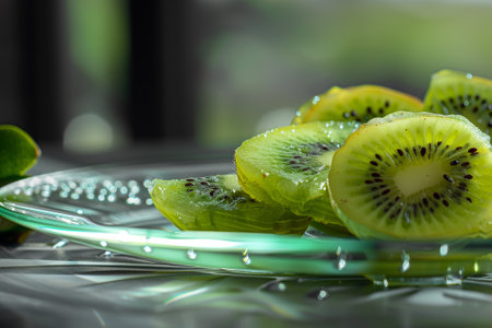 Slices of kiwi are artistically placed on a clear glass plate, highlighting their bright green color and texture. The setting emphasizes freshness and healthy eating.