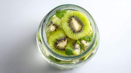 Discover a vibrant display of fresh kiwi slices paired with mint leaves in a glass jar, perfect for healthy recipes and refreshing summer dishes. Enjoy the natural beauty!