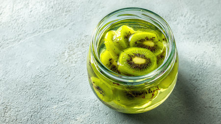 A glass jar filled with bright green sliced kiwi immersed in syrup, showcasing freshness and vibrant colors, ideal for healthy food and culinary inspiration.