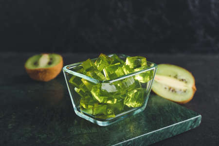 Glass bowl with tasty kiwi jelly cubes on dark background