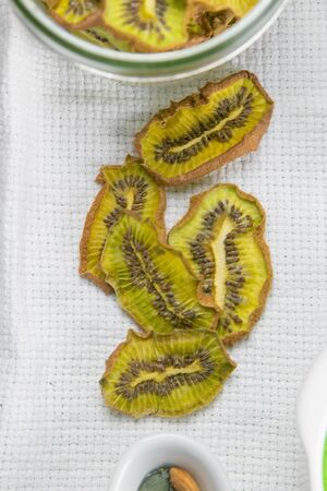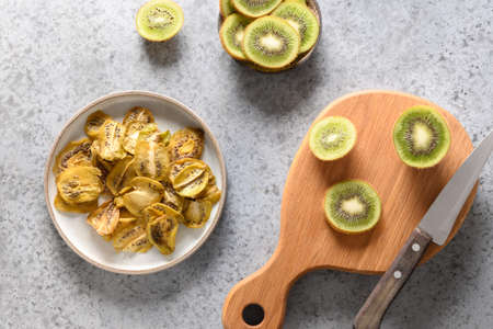 Healthy snack. Homemade dehydrated fruit chips on a gray background. Dry kiwi.