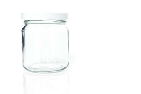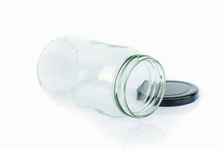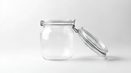 Transparent empty glass jar with open lid on a clean white background, minimal product photography for kitchen or storage concept