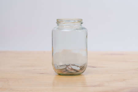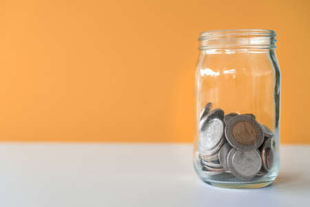 Stock Thai coin (baht) in clear glass jar. Save money or investment financial for future concept.