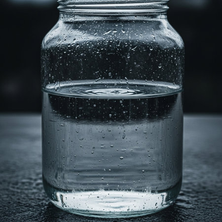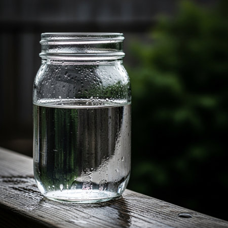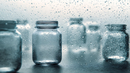 An atmospheric photo of a clear glass jar on a damp windowsill, covered in water droplets. A blurred, rain-streaked window in the background captures a quiet, contemplative mood.