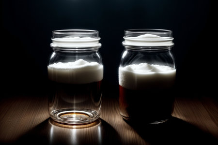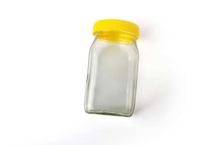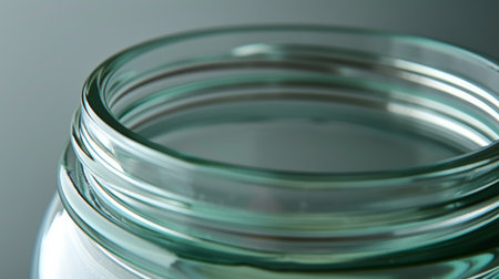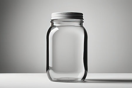 A clear glass jar, sealed with a shiny silver cap and devoid of labels, offers a blank slate for customization, set against a white canvas, Generative AI