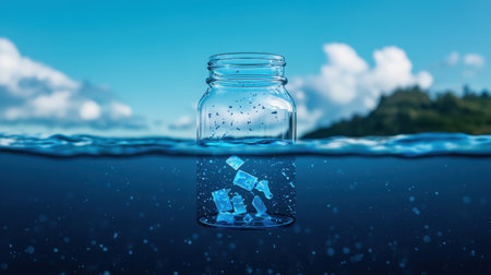 A captivating image of a glass jar submerged underwater, filled with ice cubes, highlighting themes of nature, tranquility, and environmental awareness.