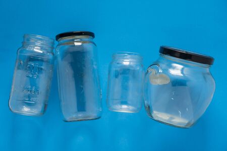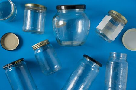 Isolated glass jars laid flat and center on blue background. Recycling program or campaign image with an assortment of top view containers. Conceptual awareness for reusable recyclables.