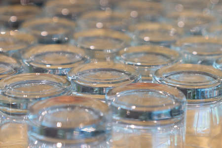 Abstract background of many empty glass of water placed on a table prepared for guests to dining in restaurant. Shallow depth of field in rows.