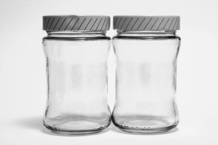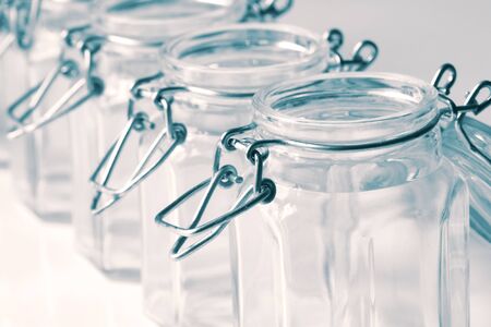 Empty glass food storage jars with a clip top seal isolated. With colour toning