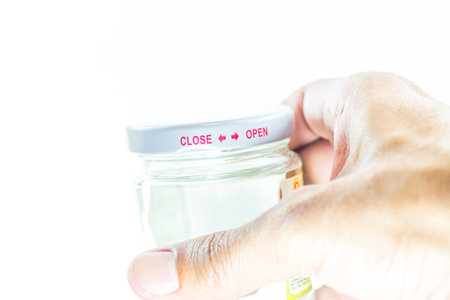 Hand closes an empty glass jar with a metallic green lid. Male hand over a glass jar. Middle-aged man of European race. Food packaging